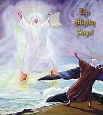 “The mighty angel who instructed John was no less a personage than Jesus Christ. Setting His right foot on the sea, and His left upon the dry land, shows the part which He is acting in the closing scenes of the great controversy with Satan. This position denotes His supreme power and authority over the whole earth. The controversy has waxed stronger and more determined from age to age, and will continue to do so, to the concluding scenes when the masterly working of the powers of darkness shall reach their height. Satan, united with evil men, will deceive the whole world and the churches who receive not the love of the truth. But the mighty angel demands attention. He cries with a loud voice. He is to show the power and authority of His voice to those who have united with Satan to oppose the truth. After these seven thunders uttered their voices, the injunction comes to John as to Daniel in regard to the little book: "Seal up those things which the seven thunders uttered" (Revelation 10:4). These relate to future events which will be disclosed in their order. Daniel shall stand in his lot at the end of the days. John sees the little book unsealed. Then Daniel's prophecies have their proper place in the first, second, and third angels' messages to be given to the world. The unsealing of the little book was the message in relation to time.”